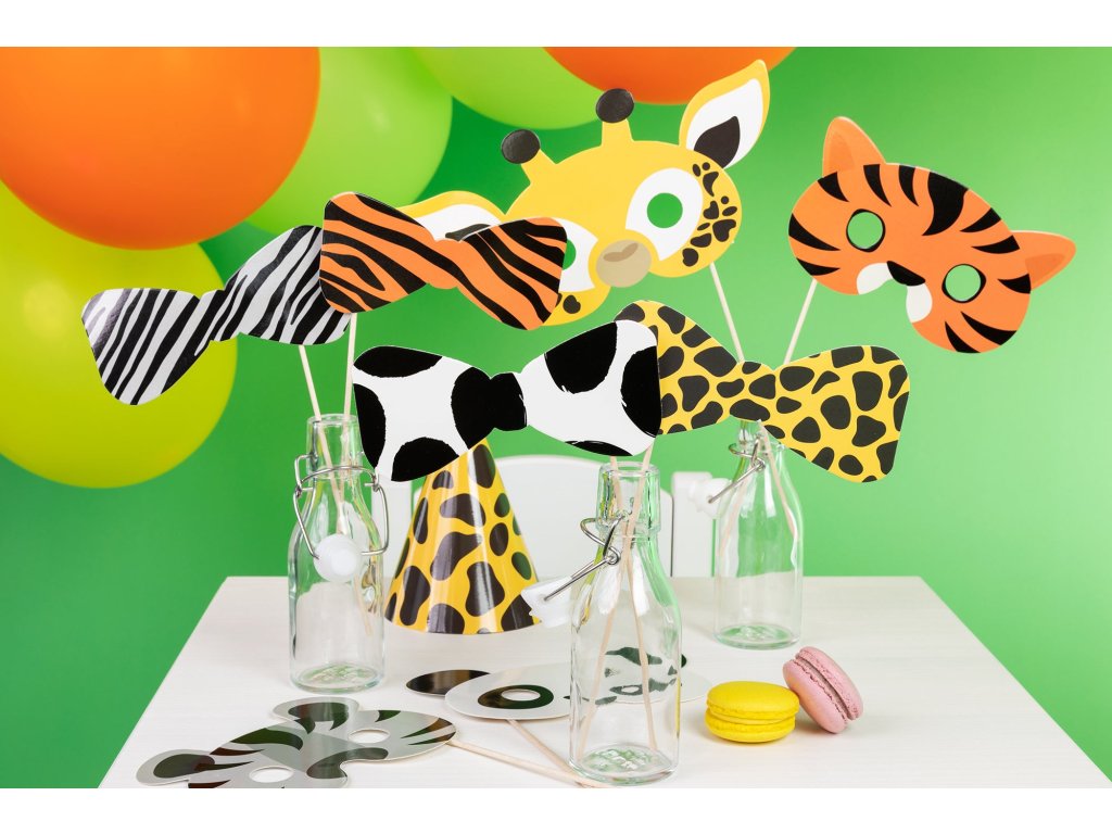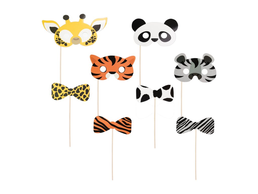 Fotografické rekvizity ve tvaru zvířecích obličejů a motýlků. Sada obsahuje masky žirafy, pandy, zebry a tygra a navíc čtyři motýlky, které k maskám ladí barvou a vzorem.