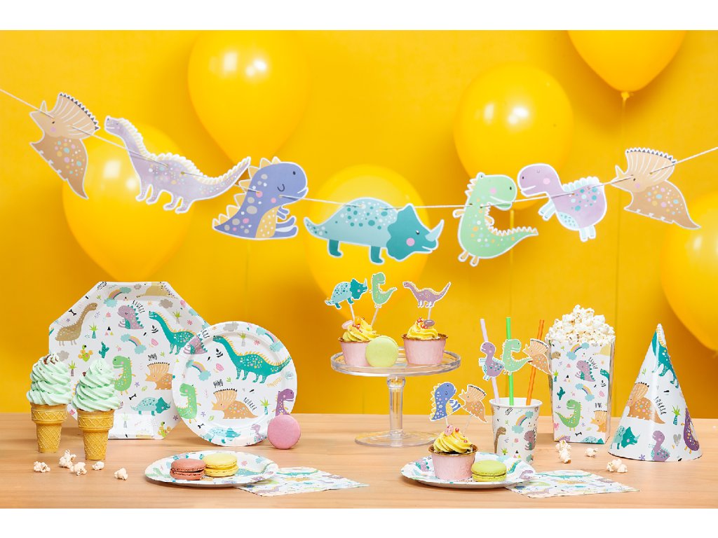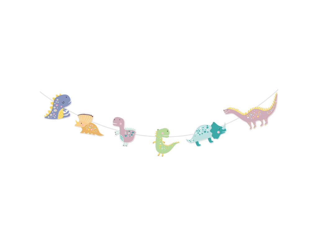 Girlanda s motivem dinosaurů bude krásným dekoračním prvkem na dětské oslavě.