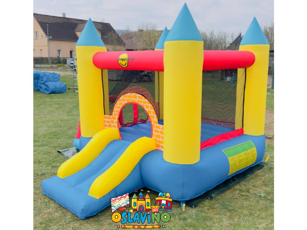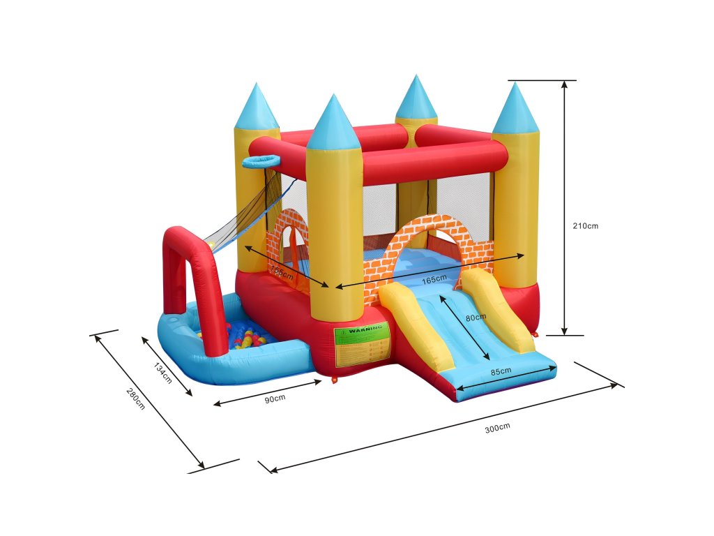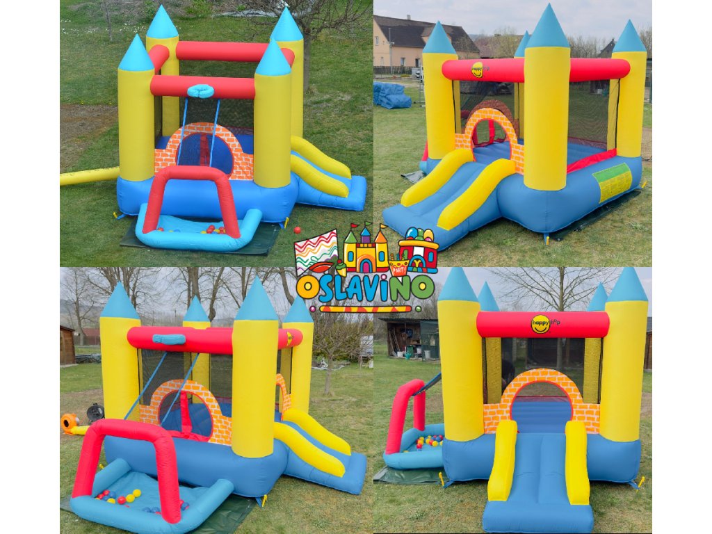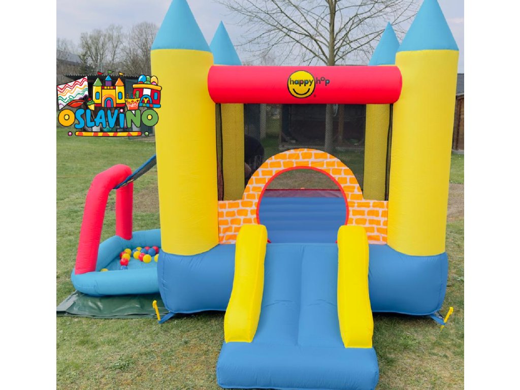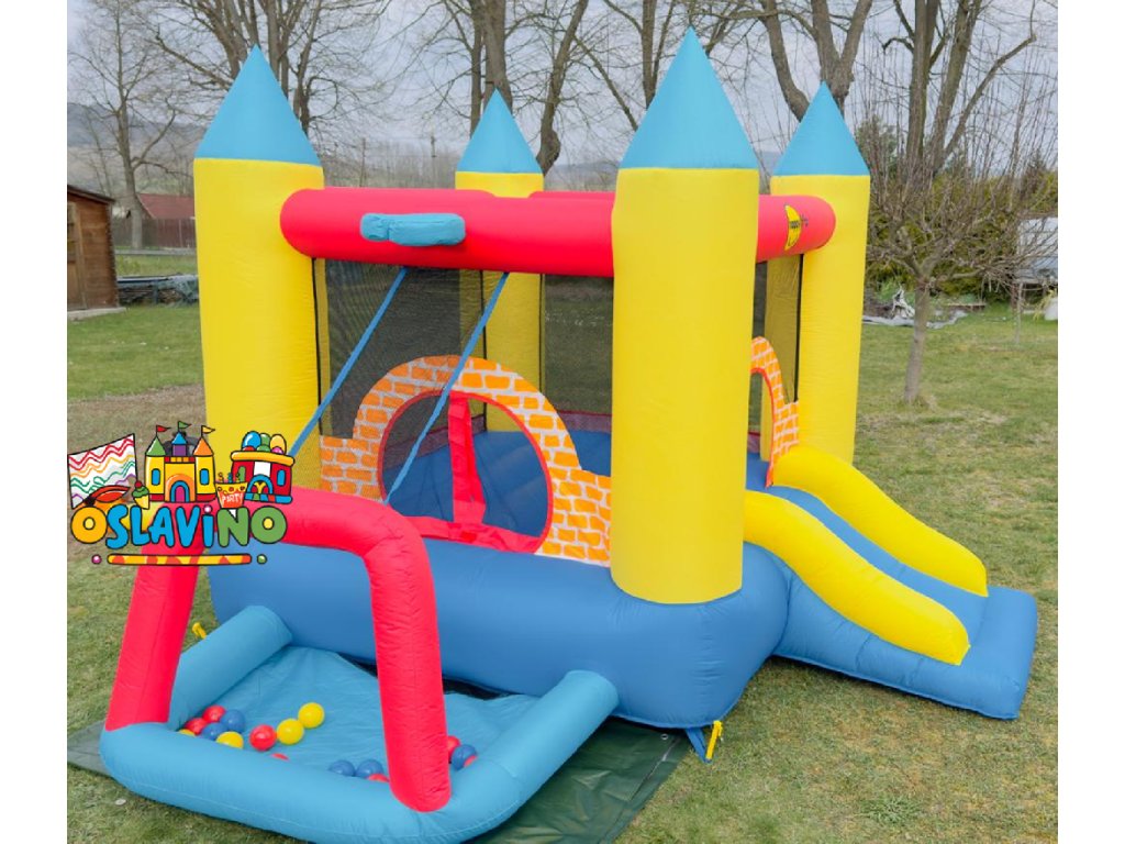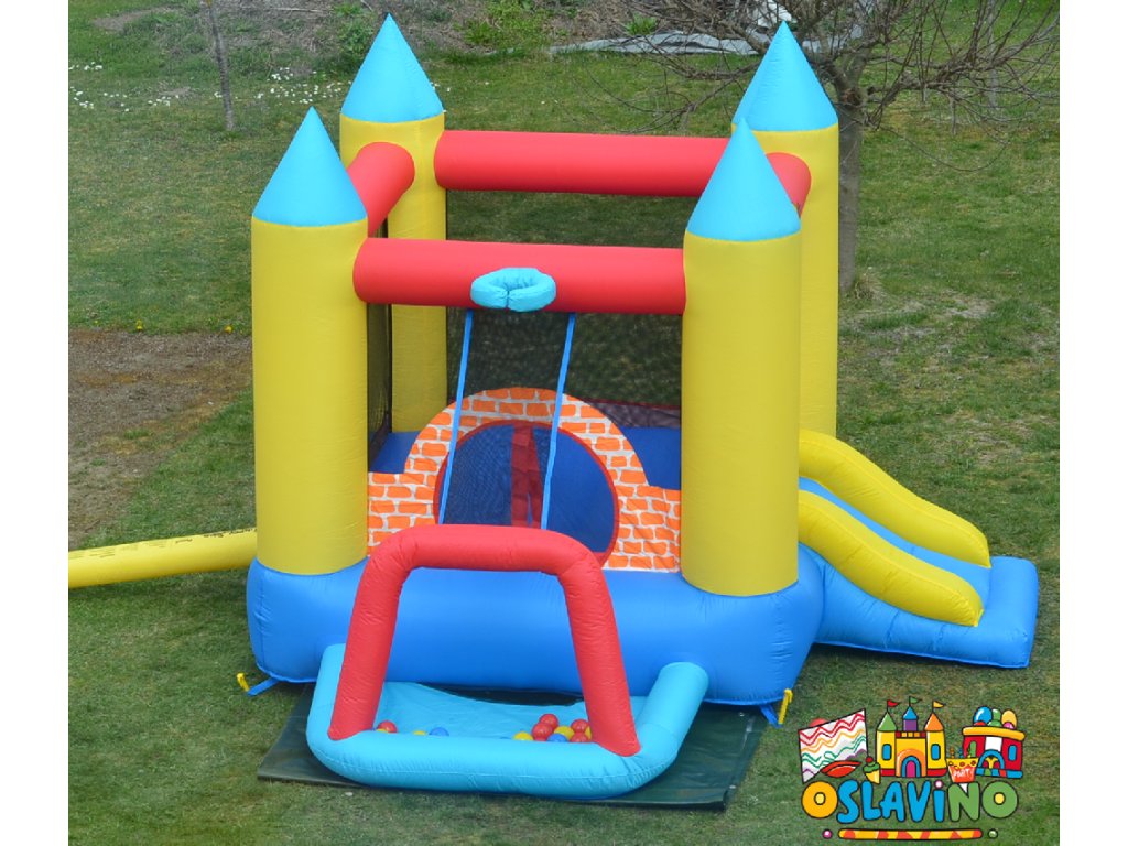 Herní centrum 4v1 je kombinací skákací plochy, skluzavky a hracího místa s barevnými míčky.