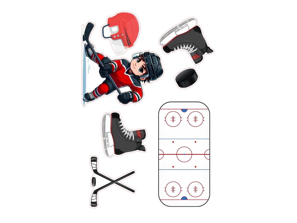 hokej: | hokej, cartoon, detsky, hrac, helma, brusle, korcule, stick, hole, puk, hriste, plocha, tym, cerveny, cerny, sport, vybava, ilus |