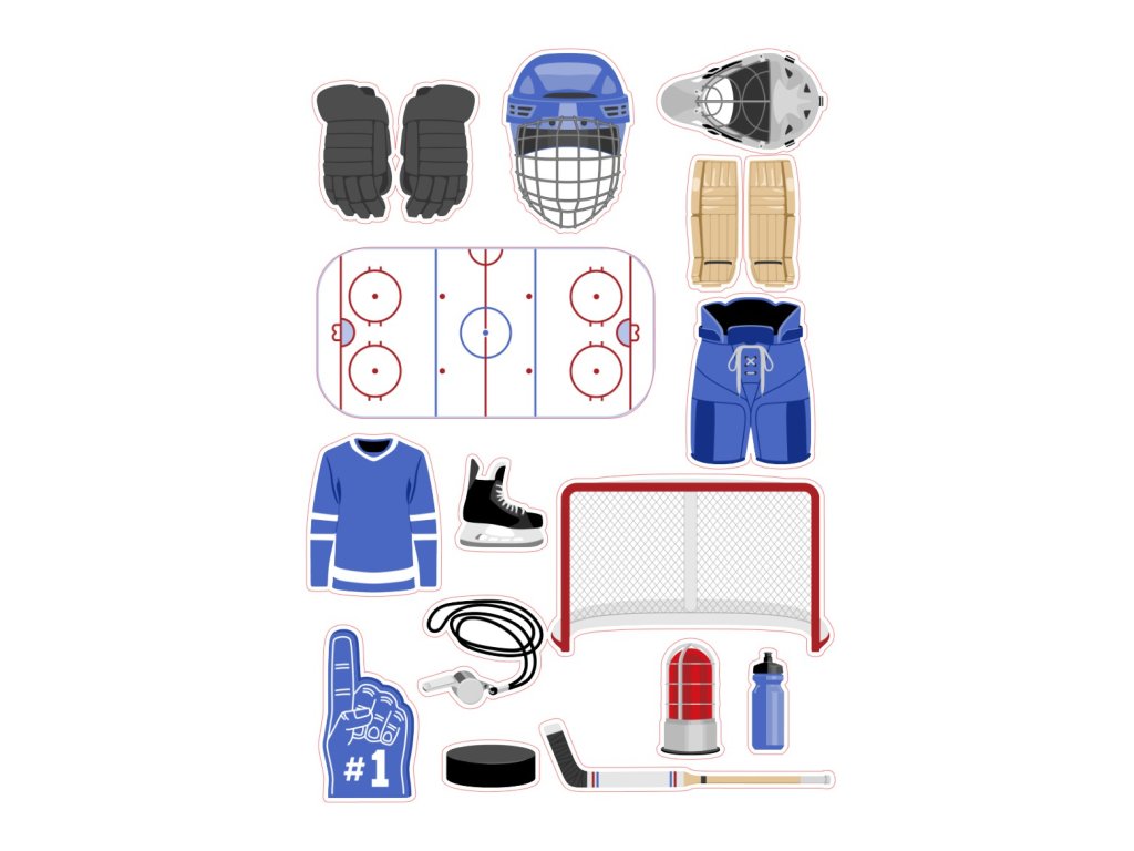 | hokej: | hokej, výstroj, vybavení, dres, helma, brusle, kalhoty, chrániče, rukavice, hokejka, branka, puk, led, sport, team, gear, equipm |