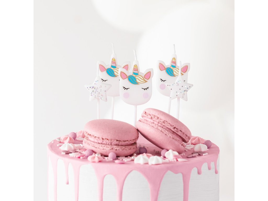 Jemné bíle svíčky s motivem jednorožce – sada 5 ks, ideální volba pro dětské narozeniny, pamlsky i tematické oslavy.