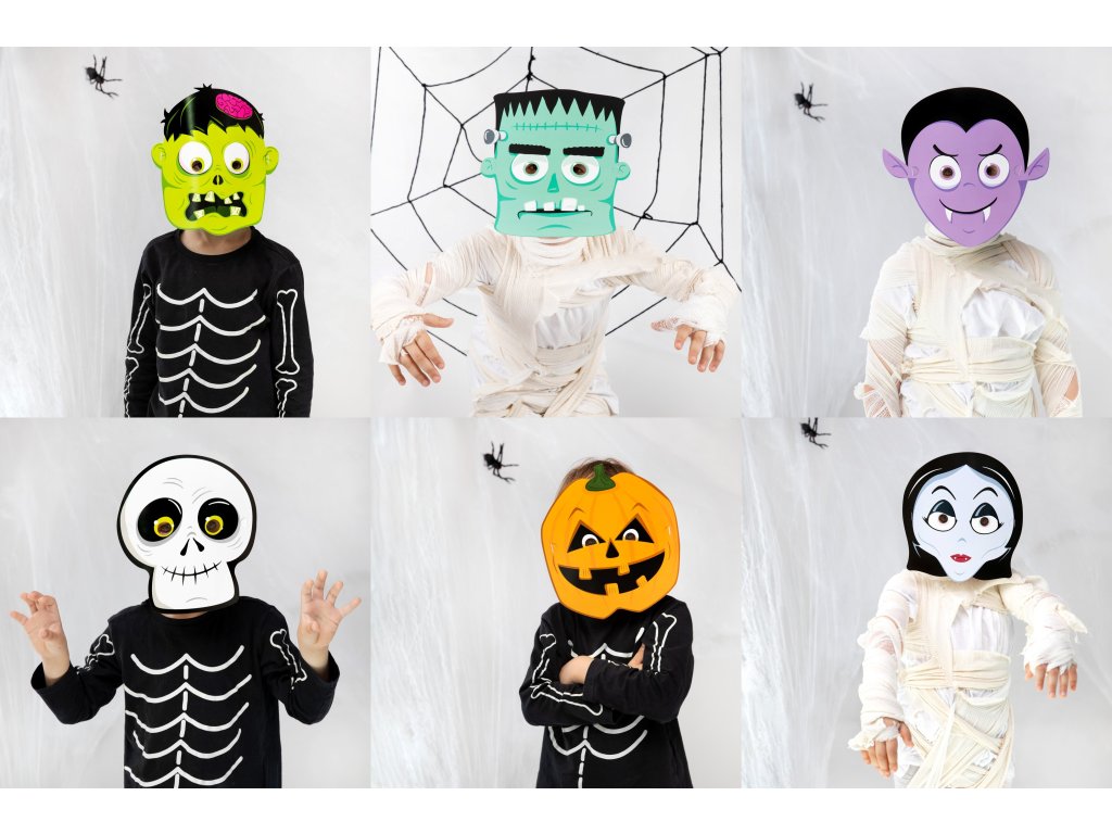 Sada obsahuje 6 papírových masek s halloweenskými motivy: zombie, Frankenstein, upír, kostlivec, dýně a upírka. Trochu strašidelné, trochu roztomilé, tyto masky jsou ideální pro dětskou oslavu.