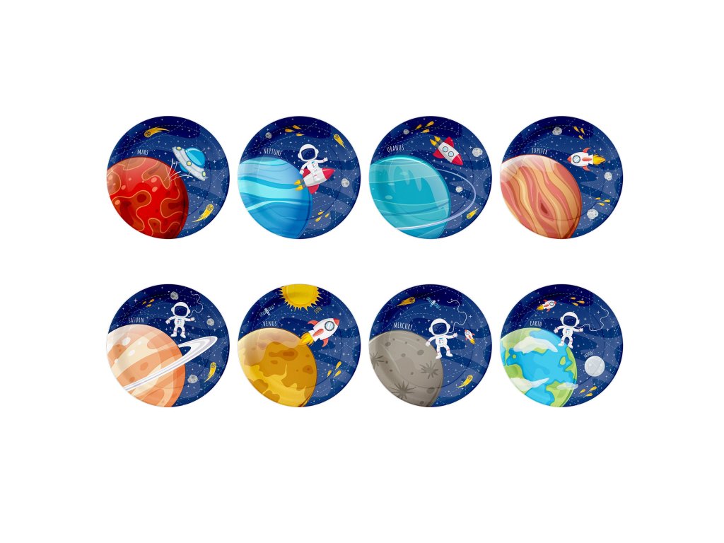 Sada obsahuje: 8 papírových talířů s planetami: Mars, Neptun, Uran, Jupiter, Saturn, Venuše, Merkur a Země