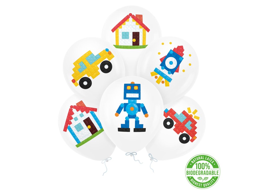 Sada obsahuje šest biologicky rozložitelných balónků s potištěnými figurkami z kostek: robot, raketa, dvě auta a dva domy. Fantastický dárek pro malého fanouška Lega.