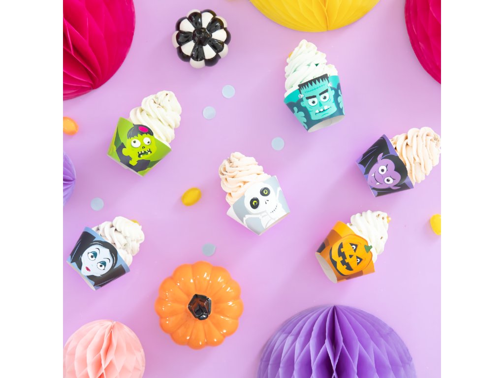 Obsahuje  6 košíčků (1 ks od každé postavy) na muffiny s motivy zombie, Frankensteina, upíra, kostlivce, dýně a upírů.