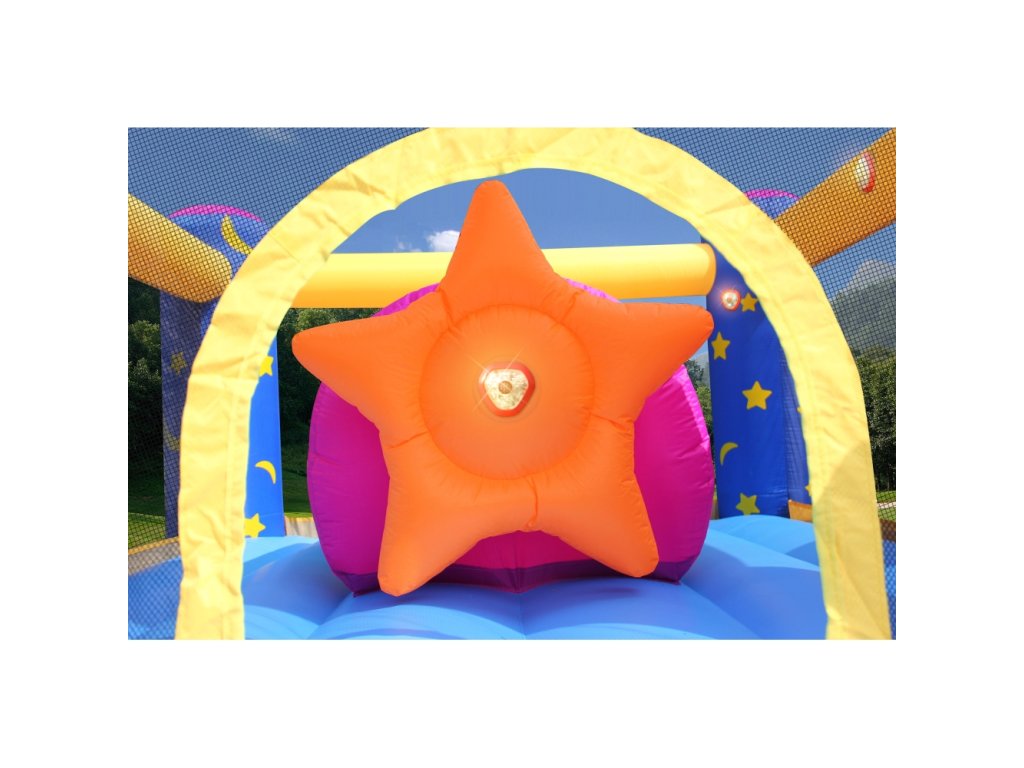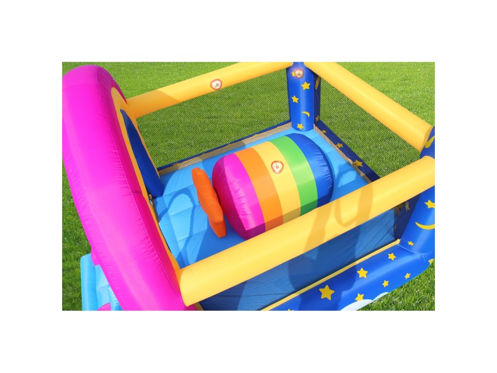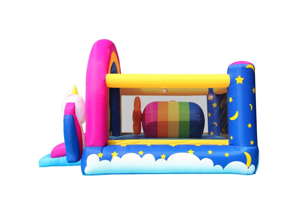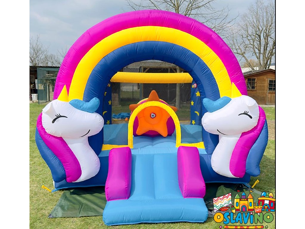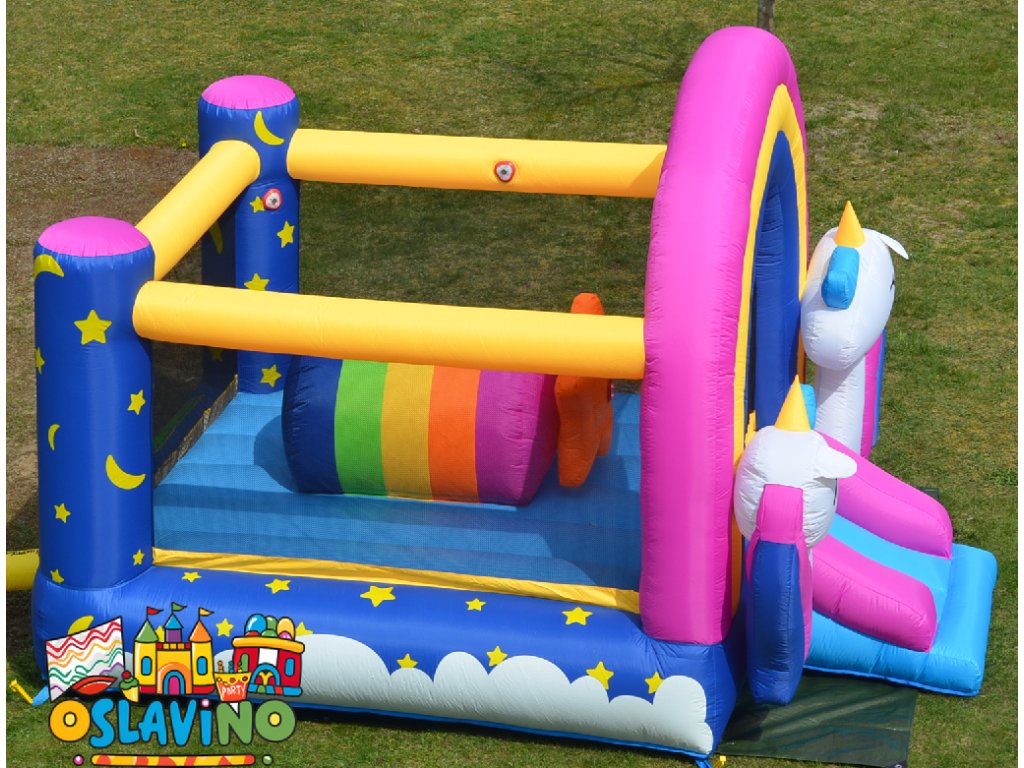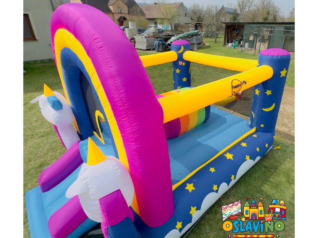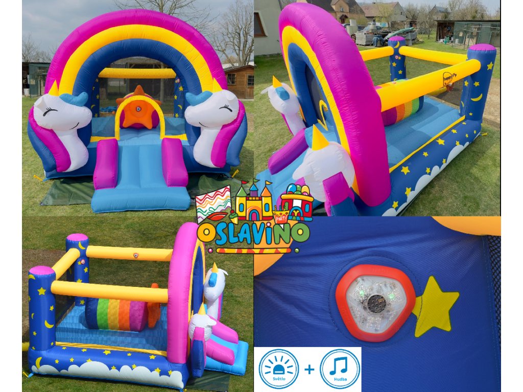 Skvělý interaktivní nafukovací skákací hrad v povedeném designu se dvěma jednorožci. Navíc šest tlačítek pro hudbu a světla. Děti si užijí skákání, hracího prostoru i skluzavky. Tlačítka reagují na stisk ruky. Krátce hrají a svítí.