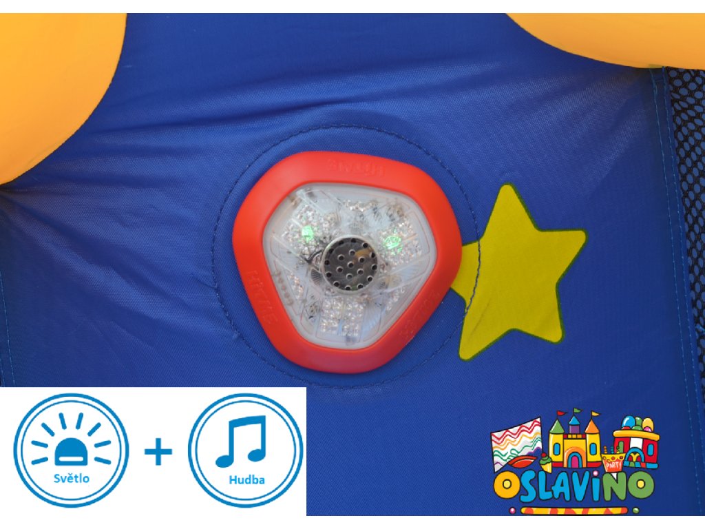 Přepravní taška, fukar 220V / 300W, kolíky na ukotvení, 6x tlačítko hudba-světlo, plachta pod hrad.