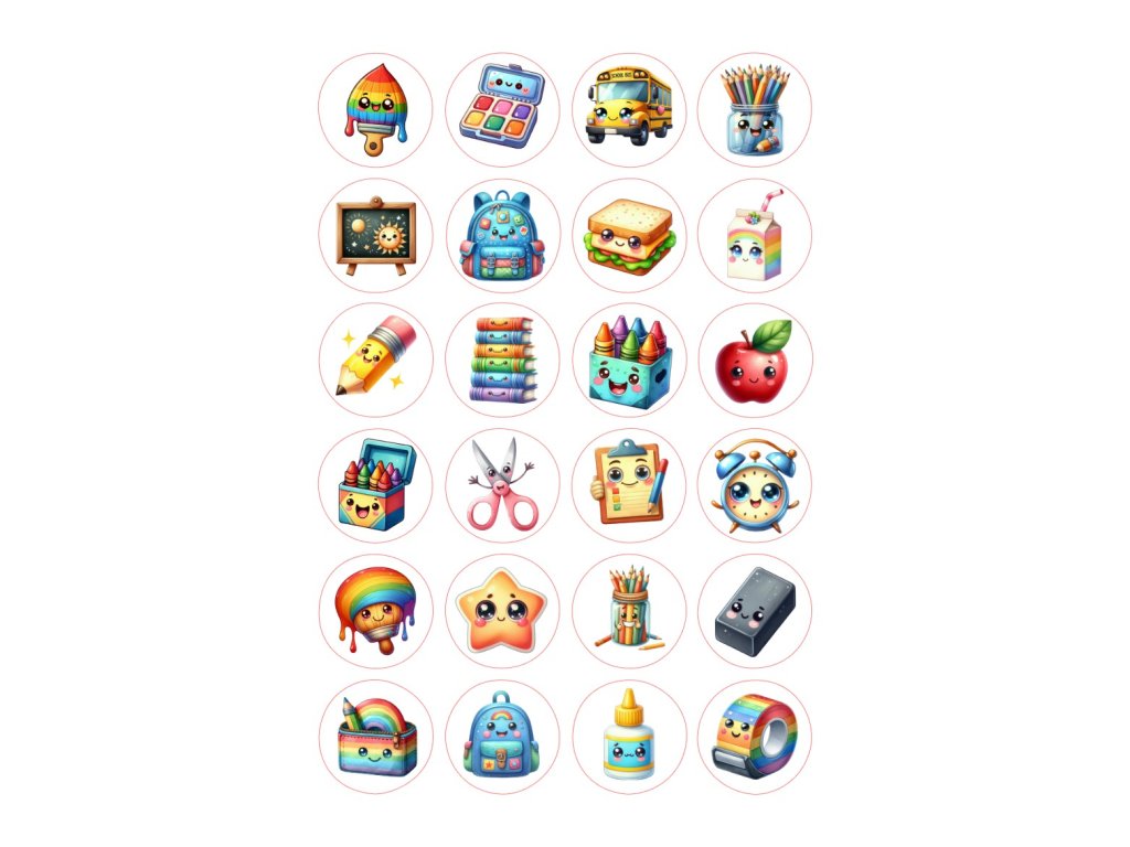 Škola: ovoce, jablko, kniha, batoh, sešit, tužka, pastelky, radost, čtení, svačina, jahoda, hruška, ananas, děti, studium