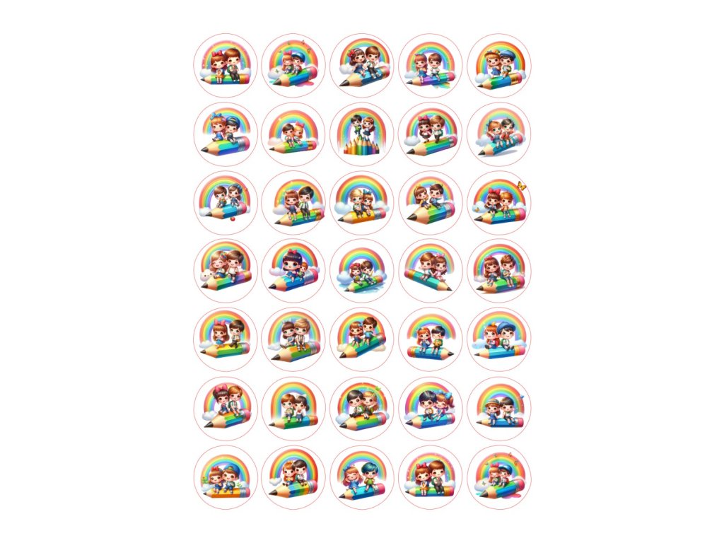 Škola: | děti, školáci, kluk, holka, kamarádi, tužka, pastelka, duha, obloha, mraky, přátelé, radost, studium |
