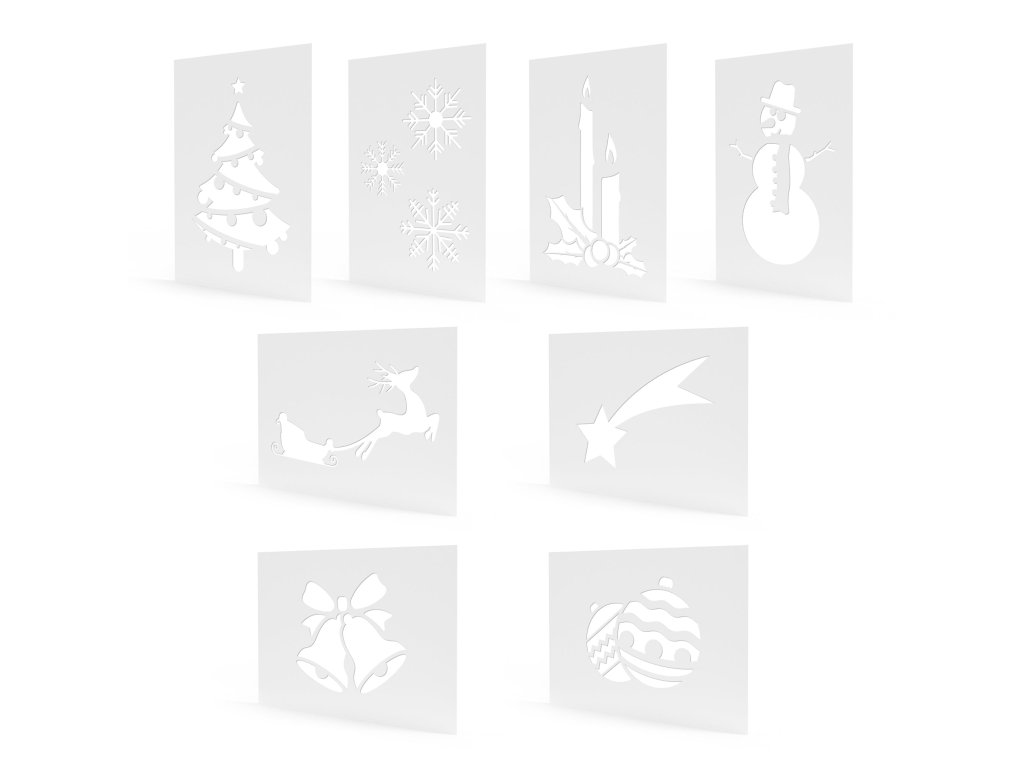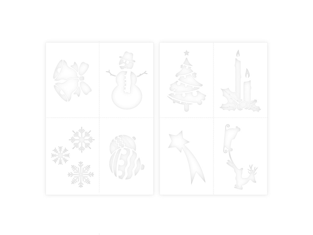 Šablony s vánoční tématikou: vánoční stromky, sněhové vločky, svíčky se snítkou cesmíny, sněhulák, Santovy sáně, vánoční hvězda, zvonky a ozdoby. Jejich využití je omezeno pouze vaší fantazií.