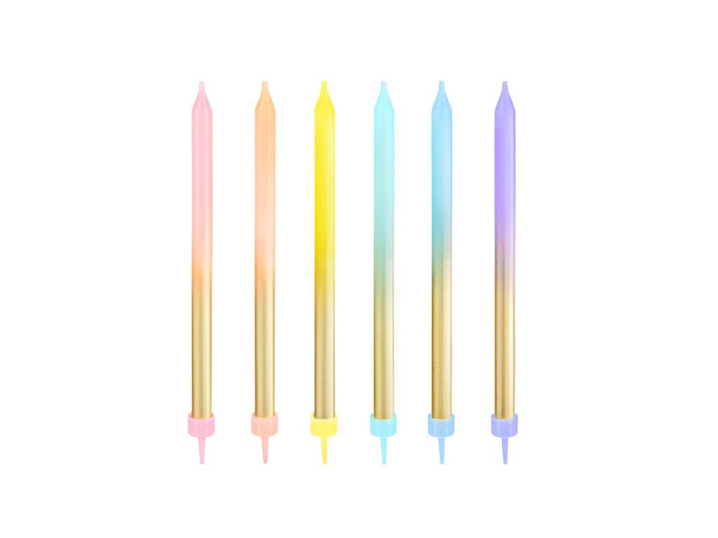 Elegantní zlaté narozeninové svíčky s jemným duhovým leskem, 6 ks v balení — ideální volba pro slavnostní dort nebo stylovou oslavu.